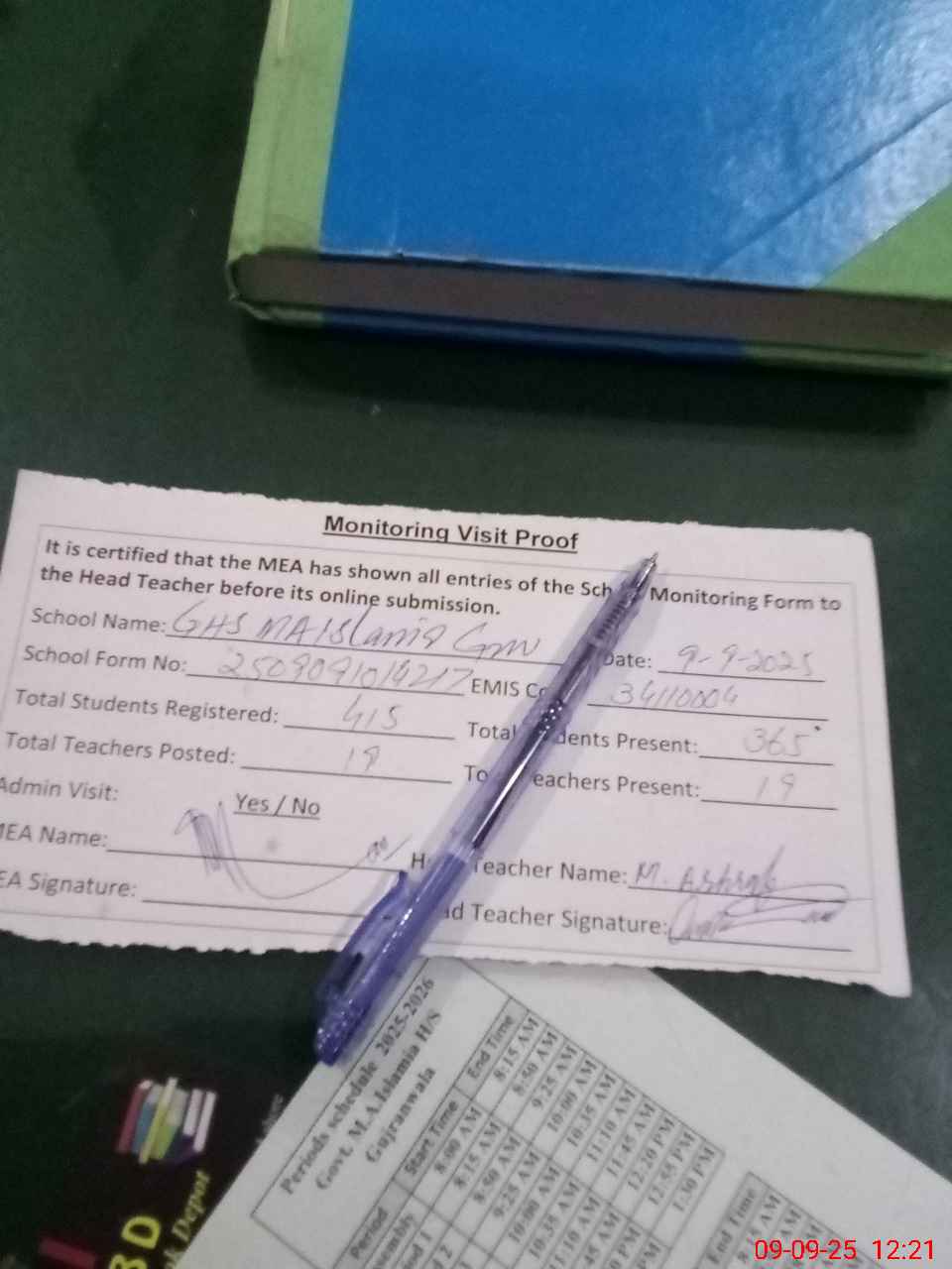 | Attendance Register | Head Teacher | MEA with School | Visit Proof |