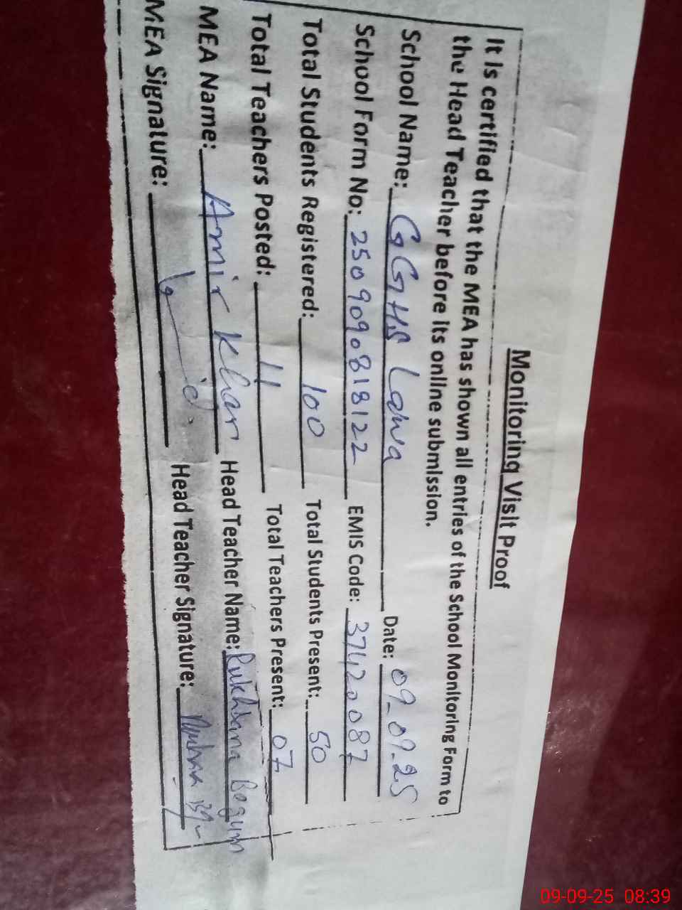 | Attendance Register | Head Teacher | MEA with School | Visit Proof |