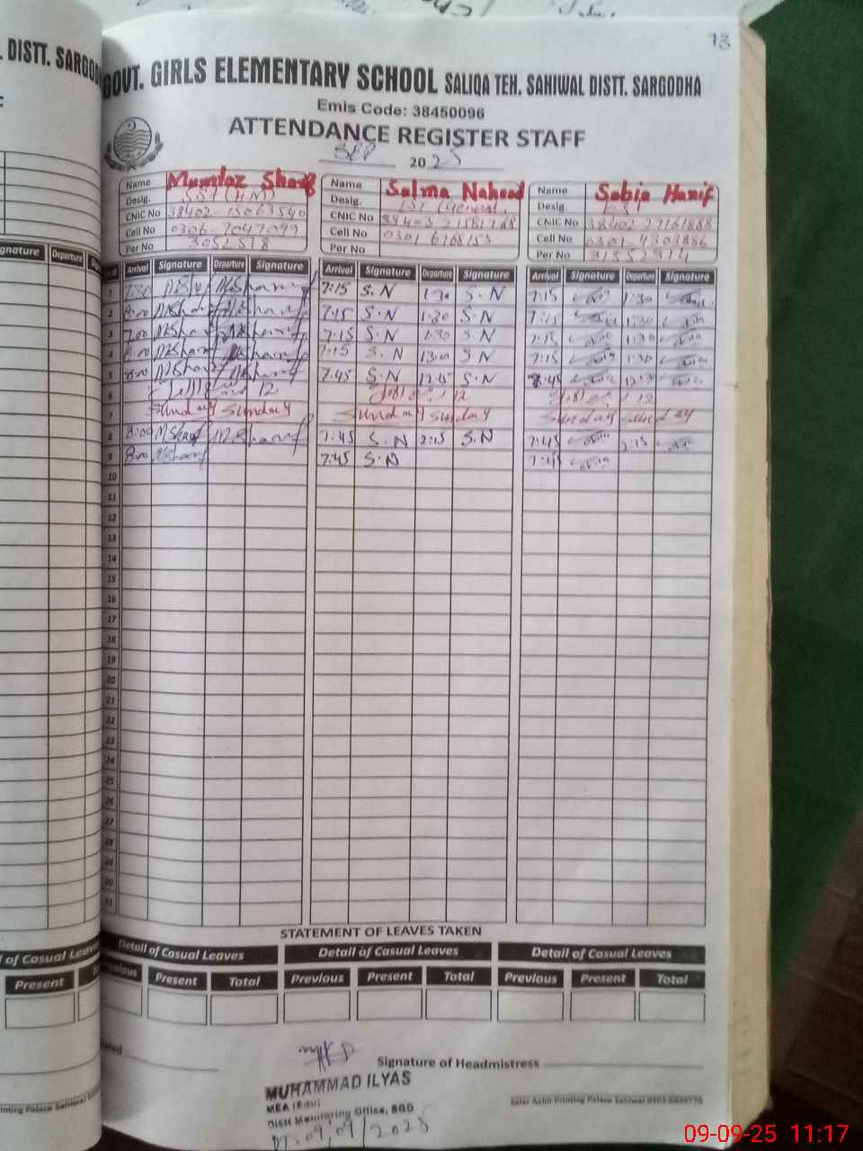| Name: MU**** SH**** Designation: (School Headmaster's/Headmistress's) SST(Gen) Phone/Cell Number: 03**** |