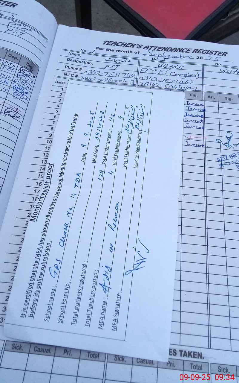 | Attendance Register | Head Teacher | MEA with School | Visit Proof |