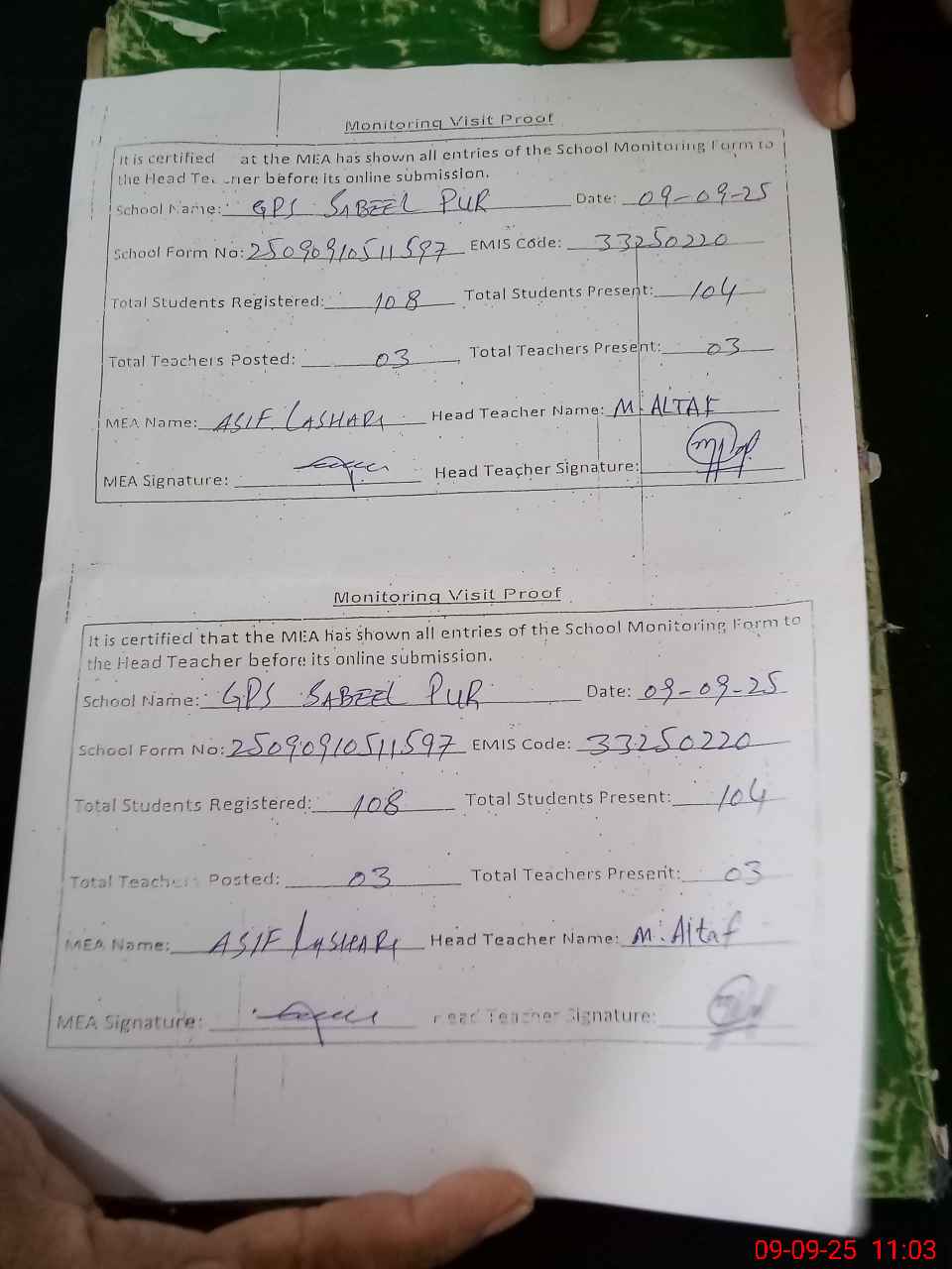 | Attendance Register | Head Teacher | MEA with School | Visit Proof |