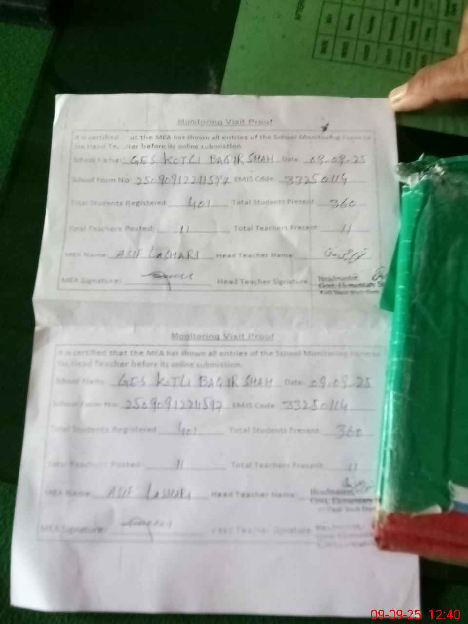 | Attendance Register | Head Teacher | MEA with School | Visit Proof |