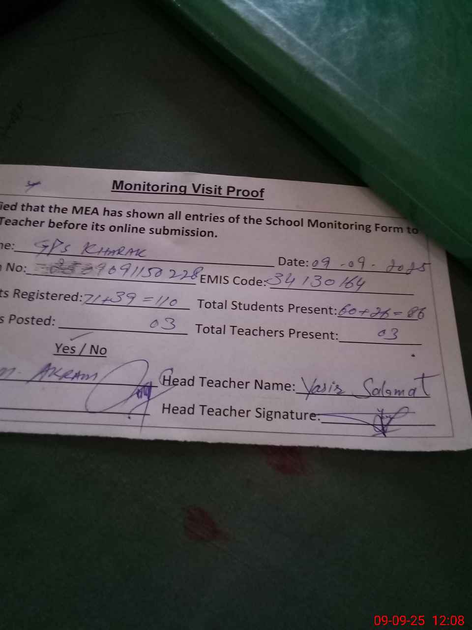 | Attendance Register | Head Teacher | MEA with School | Visit Proof |