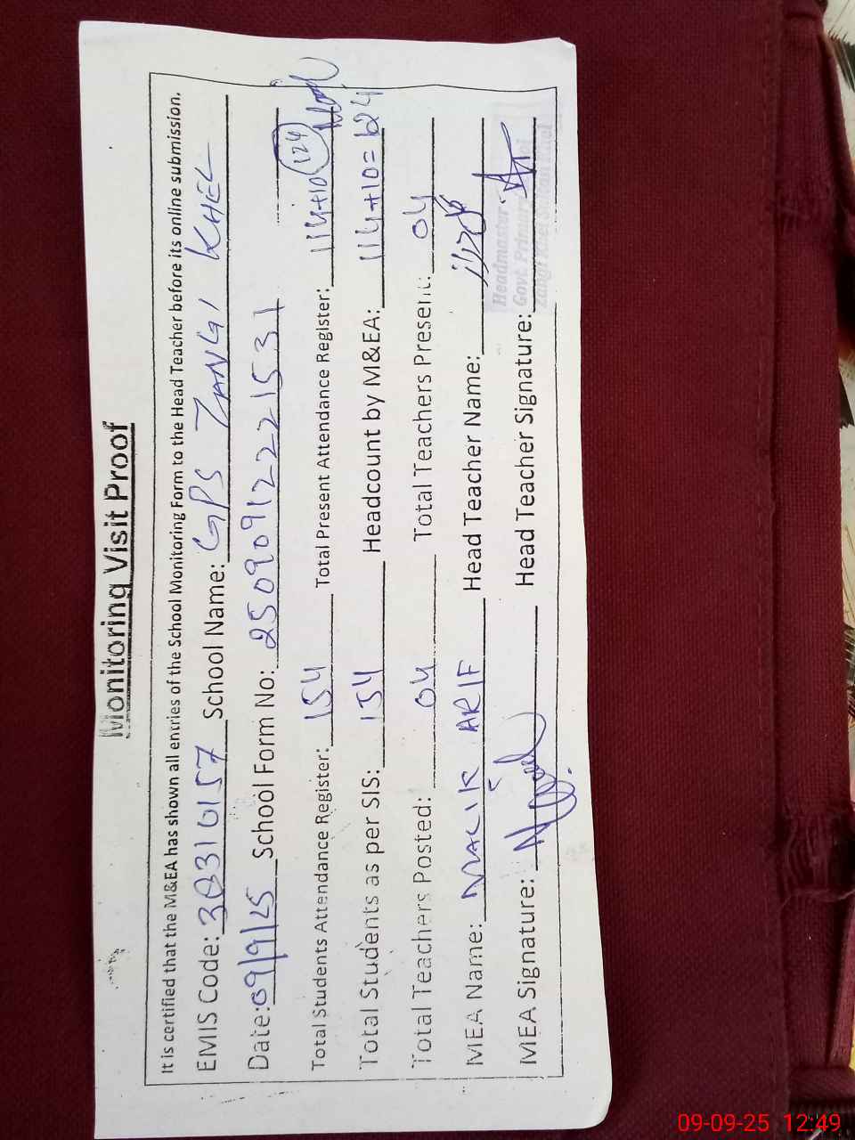 | Attendance Register | Head Teacher | MEA with School | Visit Proof |