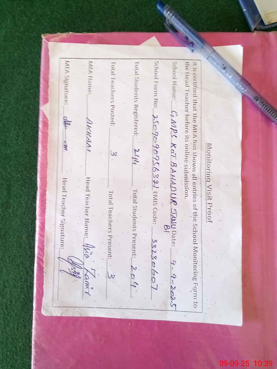 | Certified that this School was Inspected by the Undersigned MEA/DMO Today and the Information Stated Above is as Per Record. | |||||