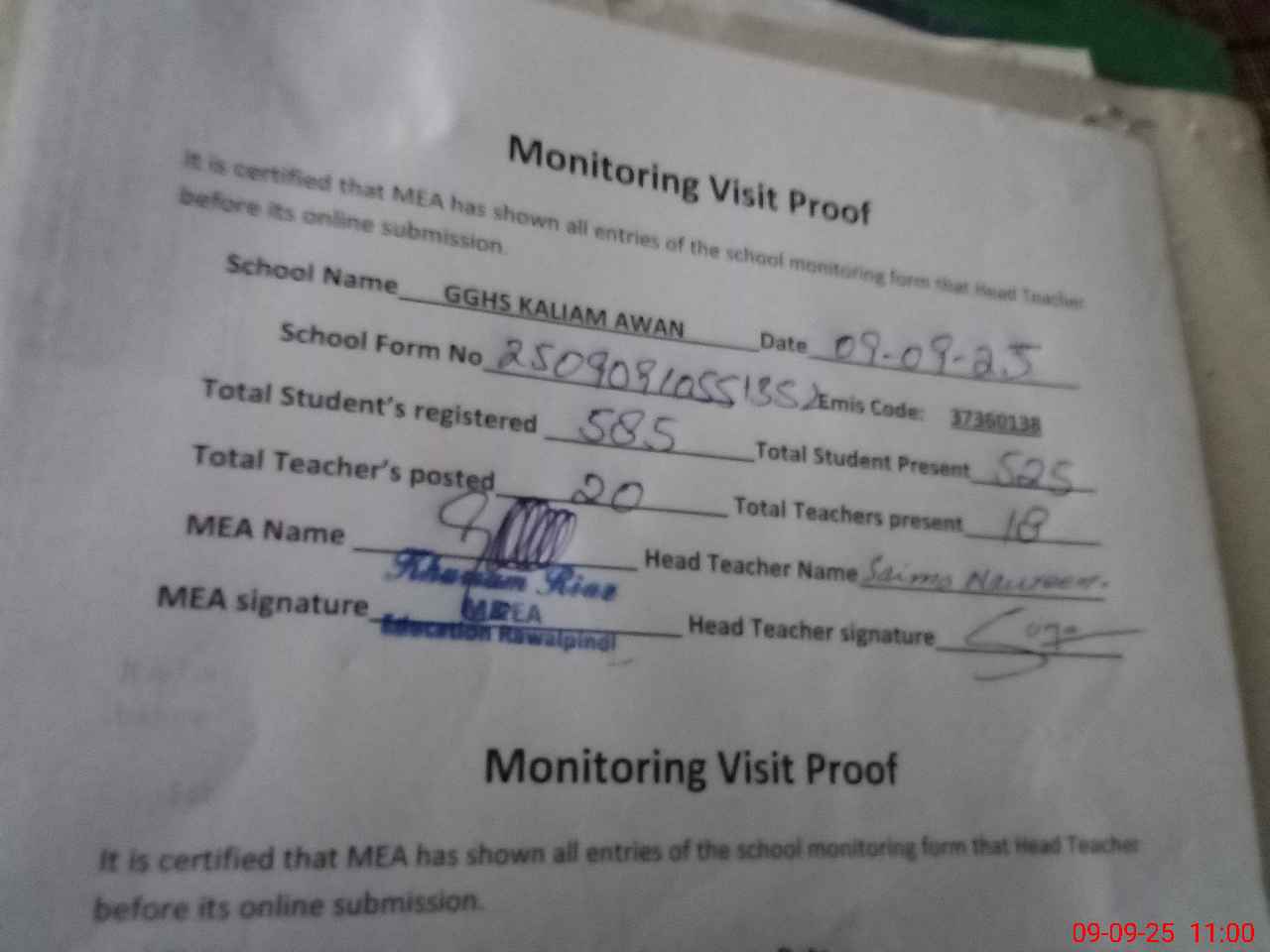 | Attendance Register | Head Teacher | MEA with School | Visit Proof |