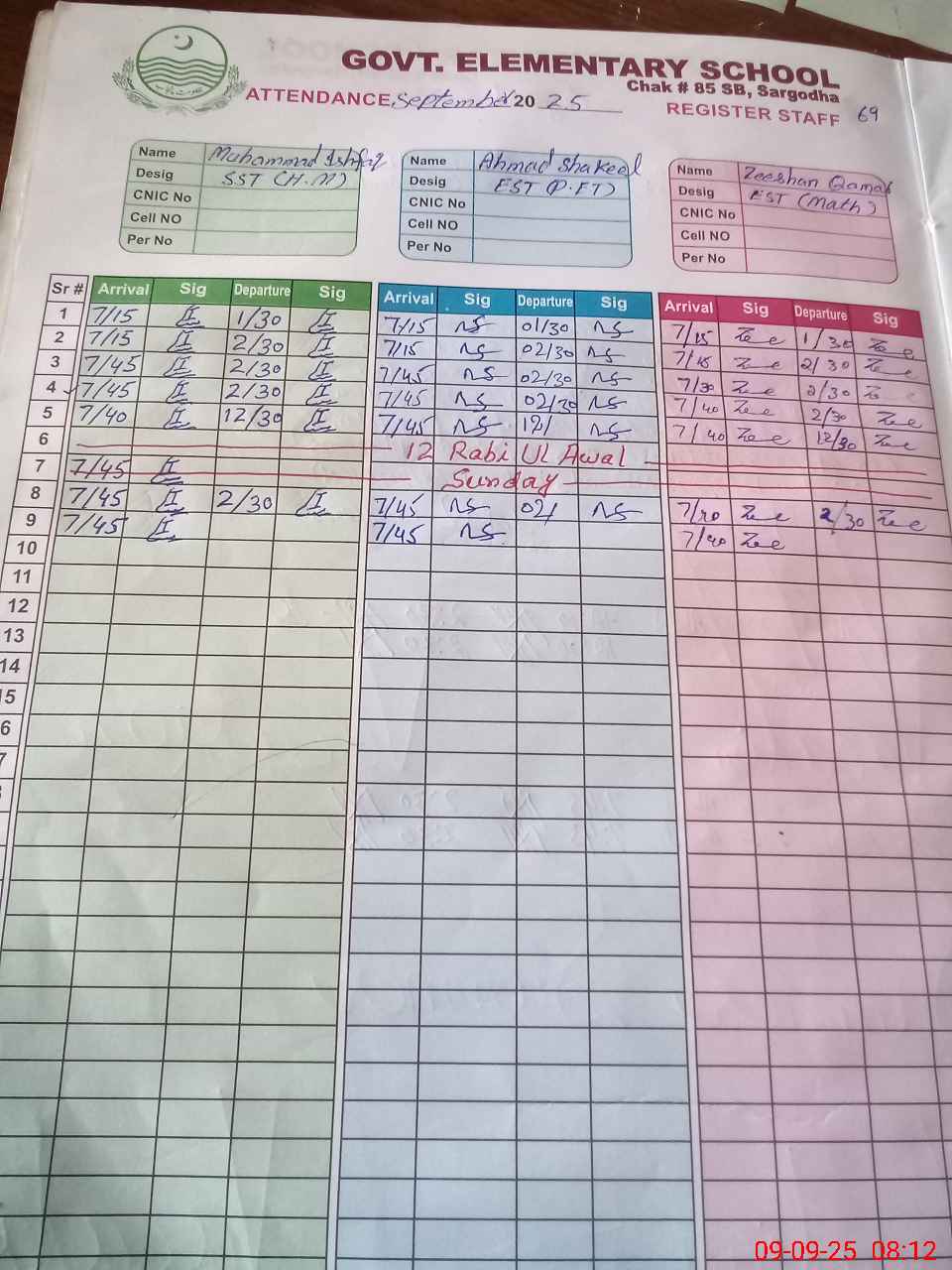 | CNIC | Full Name | Designation | R/C | Absence During Last Calender Month |