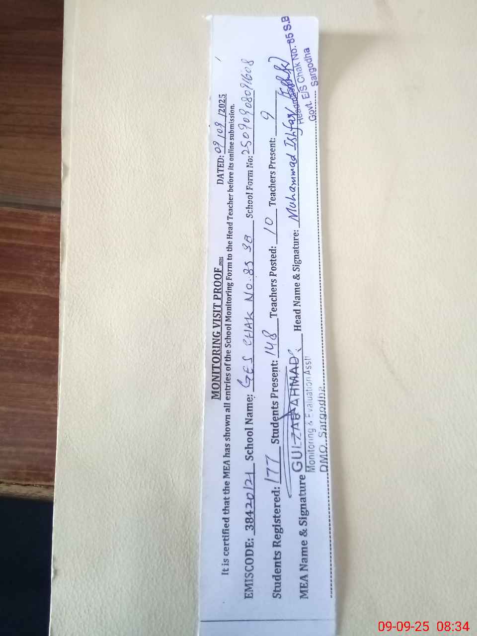 | Attendance Register | Head Teacher | MEA with School | Visit Proof |