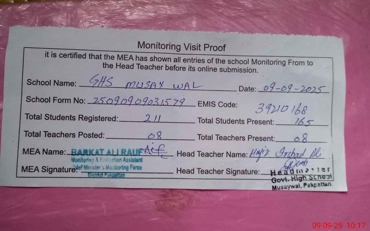 | EMIS Code: 39210168 | Name of School: GHS MUSAY WAL P/O 39/SP PAKPATTAN | |||