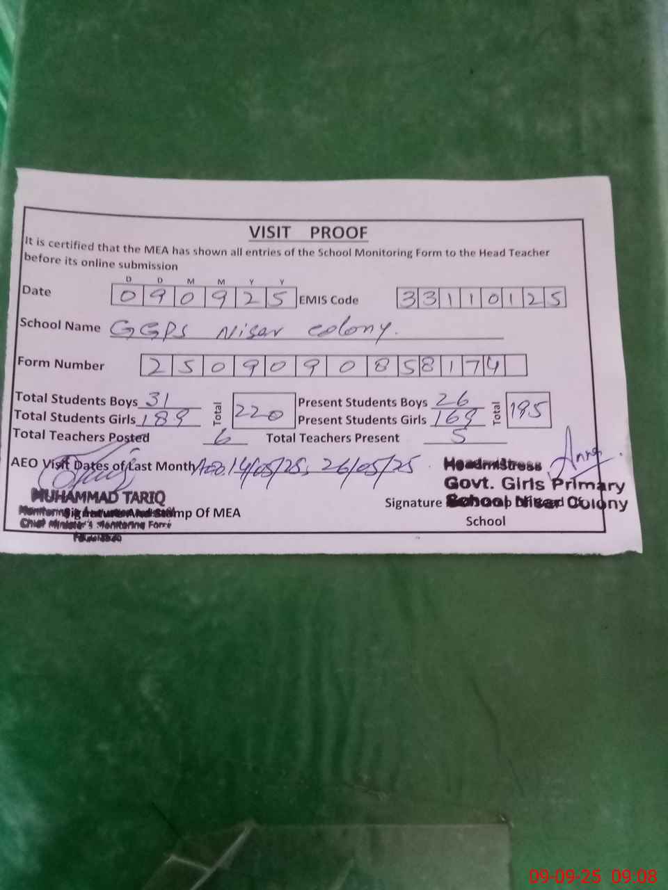 | EMIS Code: 33110125 | Name of School: GGPS NISAR COLONY | |||