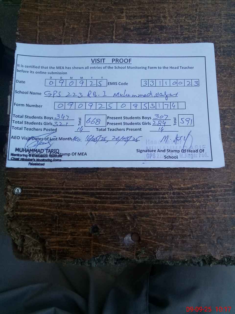 | EMIS Code: 33110023 | Name of School: GPS 223 RB I MUHAMMAD NAGAR FSD | |||
