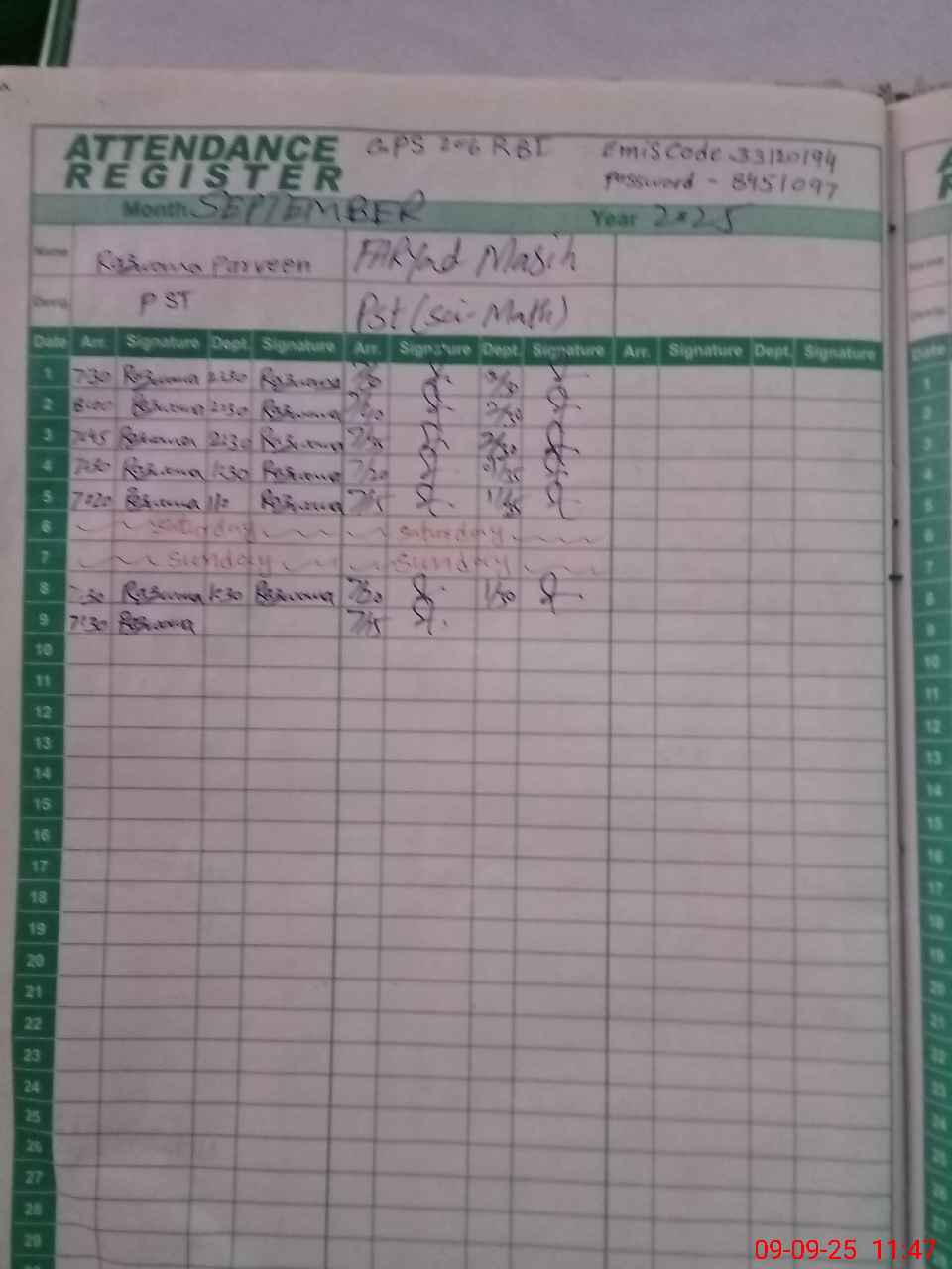 | Monitoring Date: 09-09-2025 | Start Time: 09-09-2025 11:39 AM | End Time: 09-09-2025 11:48 AM | Name of MEA: MA**** HU**** | |