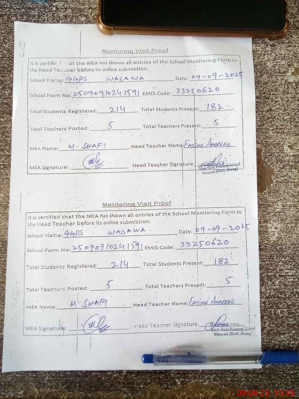 | Certified that this School was Inspected by the Undersigned MEA/DMO Today and the Information Stated Above is as Per Record. | |||||