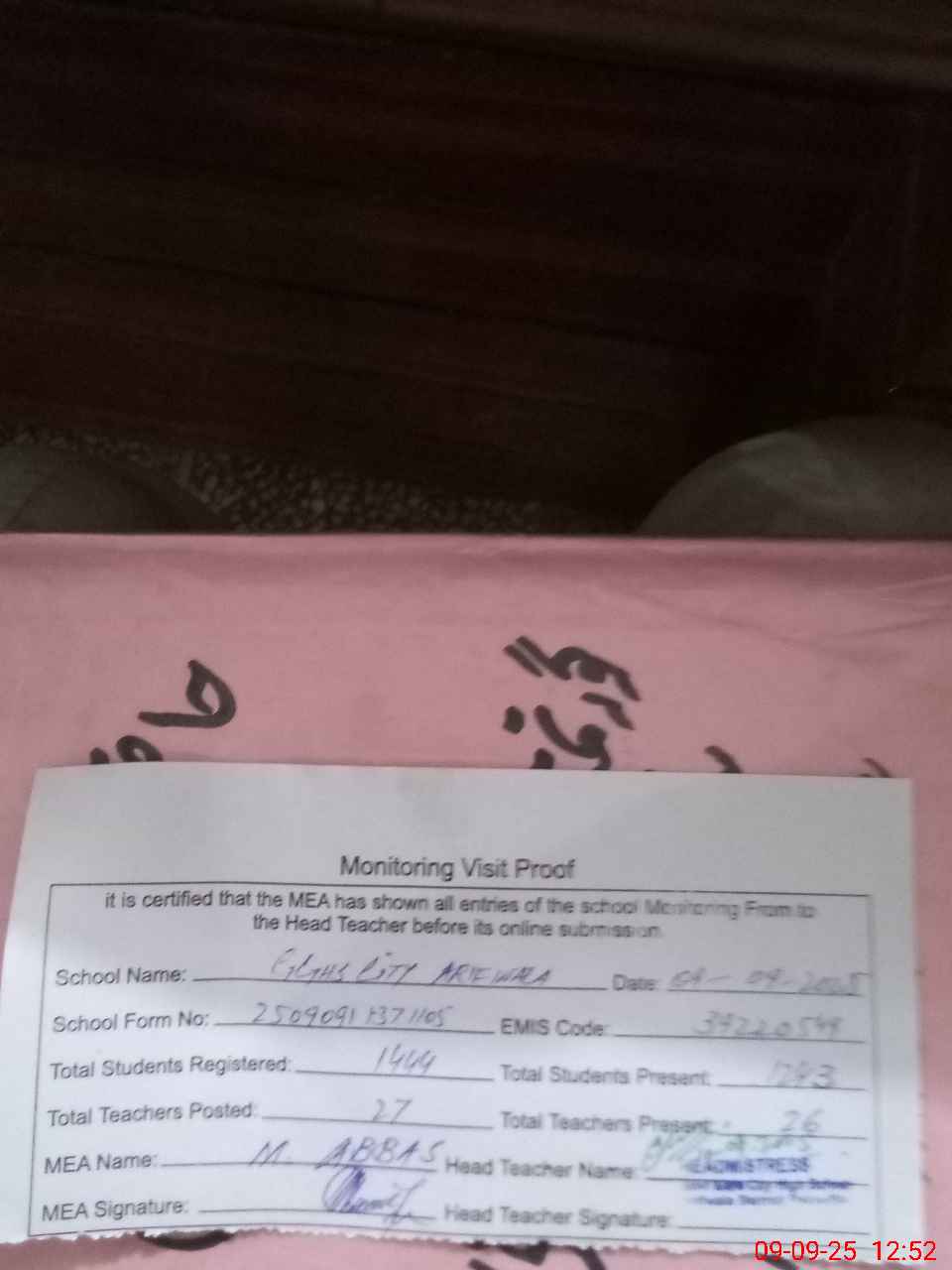 | Certified that this School was Inspected by the Undersigned MEA/DMO Today and the Information Stated Above is as Per Record. | |||||