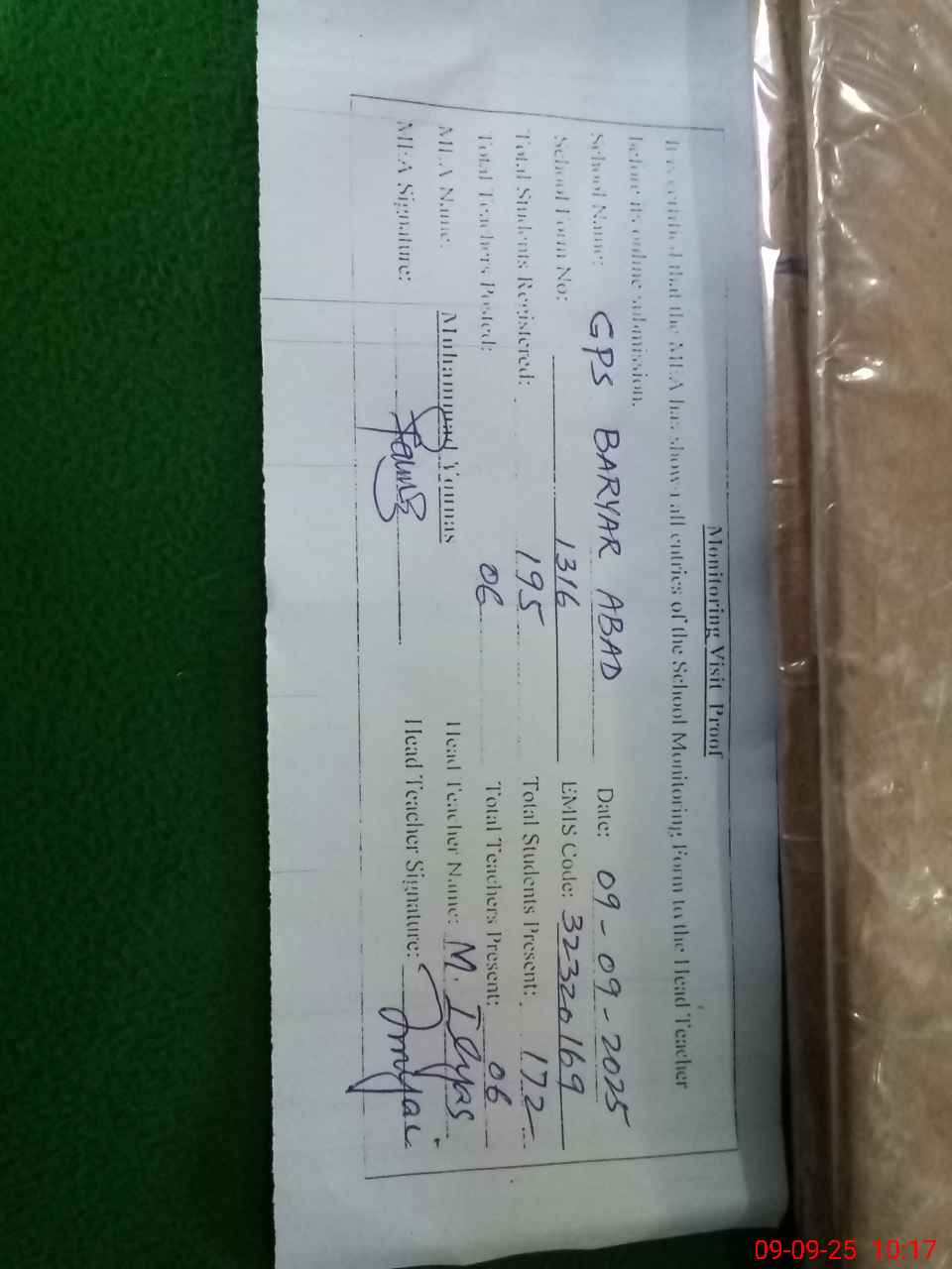 | Monitoring Date: 09-09-2025 | Start Time: 09-09-2025 09:31 AM | End Time: 09-09-2025 10:17 AM | Name of MEA: MU**** YO**** | |