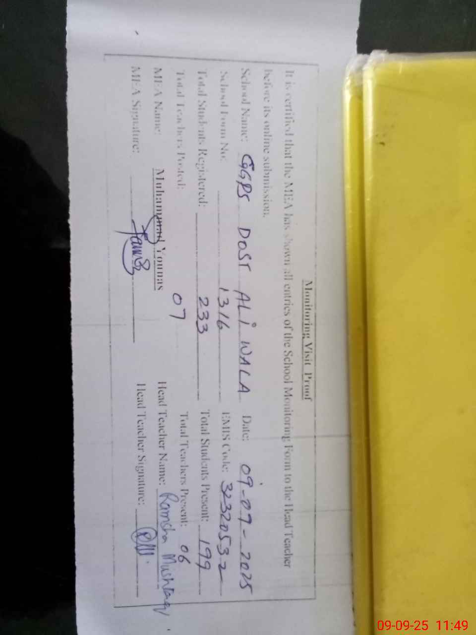 | Attendance Register | Head Teacher | MEA with School | Visit Proof |