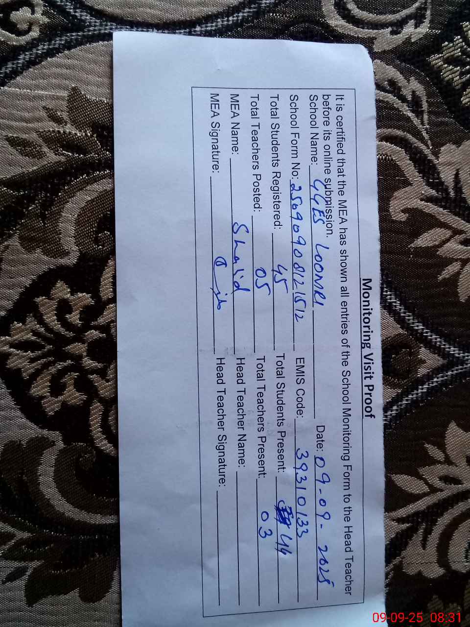 | Certified that this School was Inspected by the Undersigned MEA/DMO Today and the Information Stated Above is as Per Record. | |||||