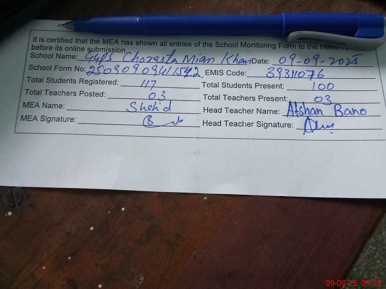 | Attendance Register | Head Teacher | MEA with School | Visit Proof |