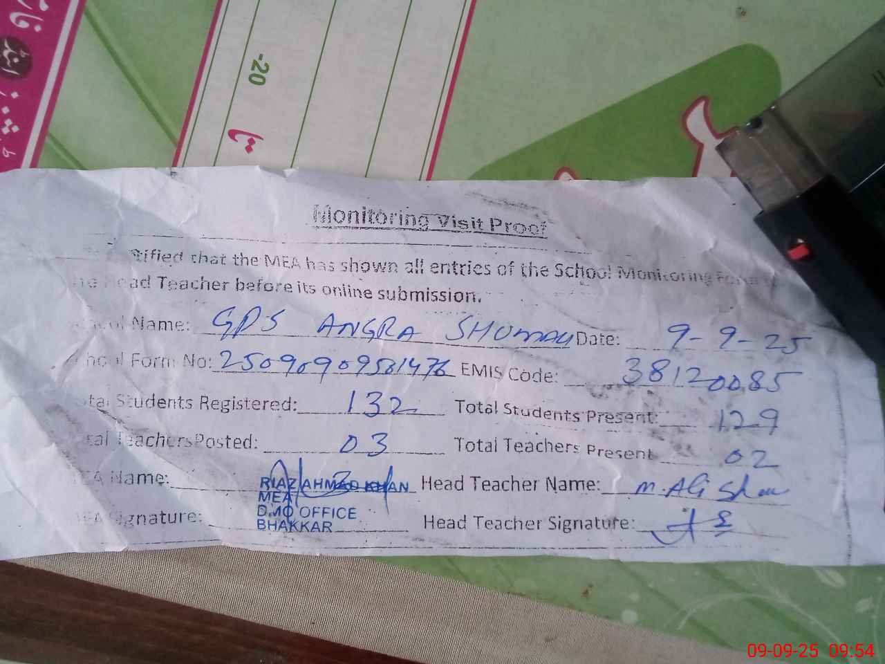 | Attendance Register | Head Teacher | MEA with School | Visit Proof |