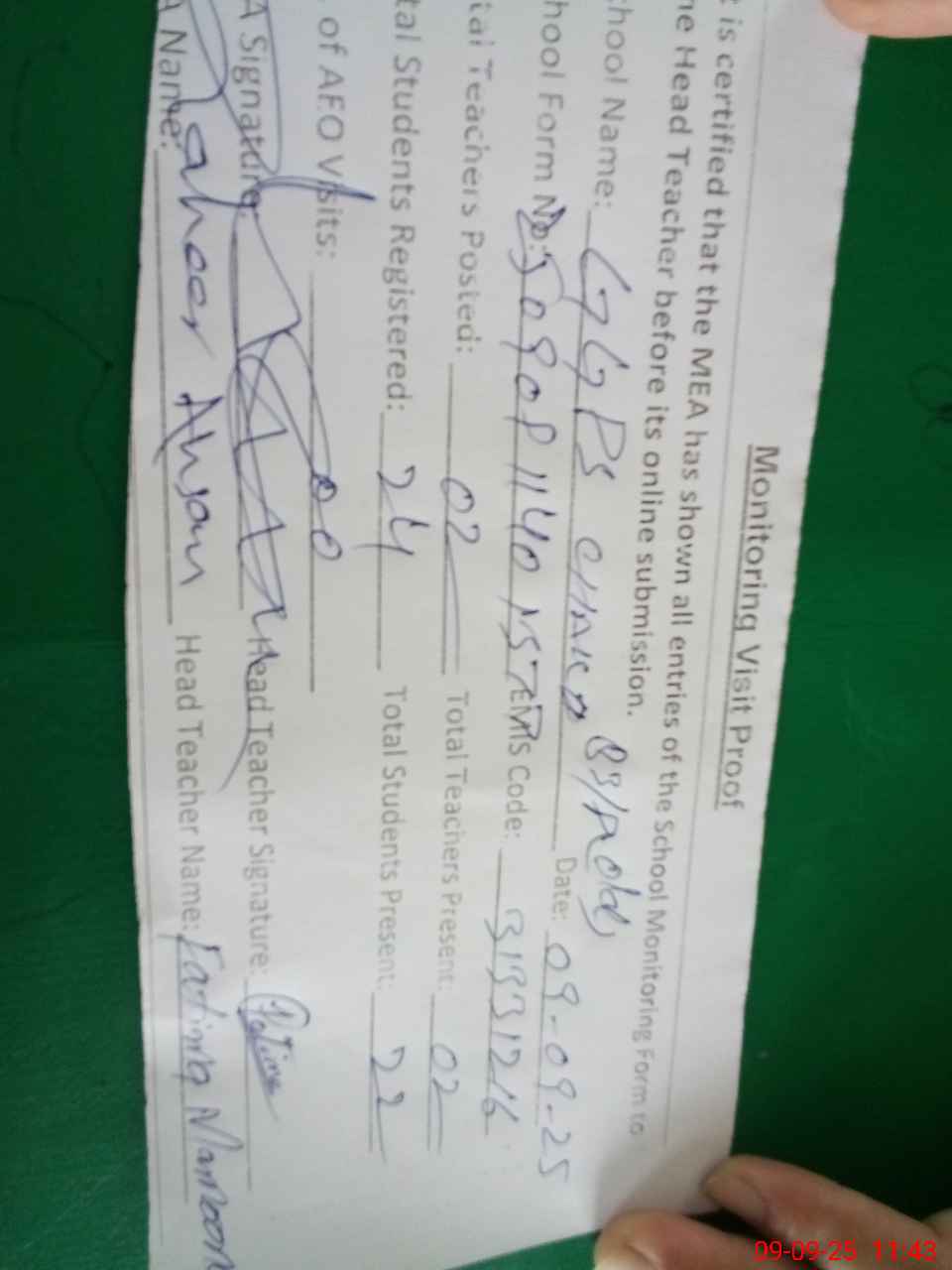 | Monitoring Date: 09-09-2025 | Start Time: 09-09-2025 11:24 AM | End Time: 09-09-2025 11:51 AM | Name of MEA: Za**** Ah**** | |