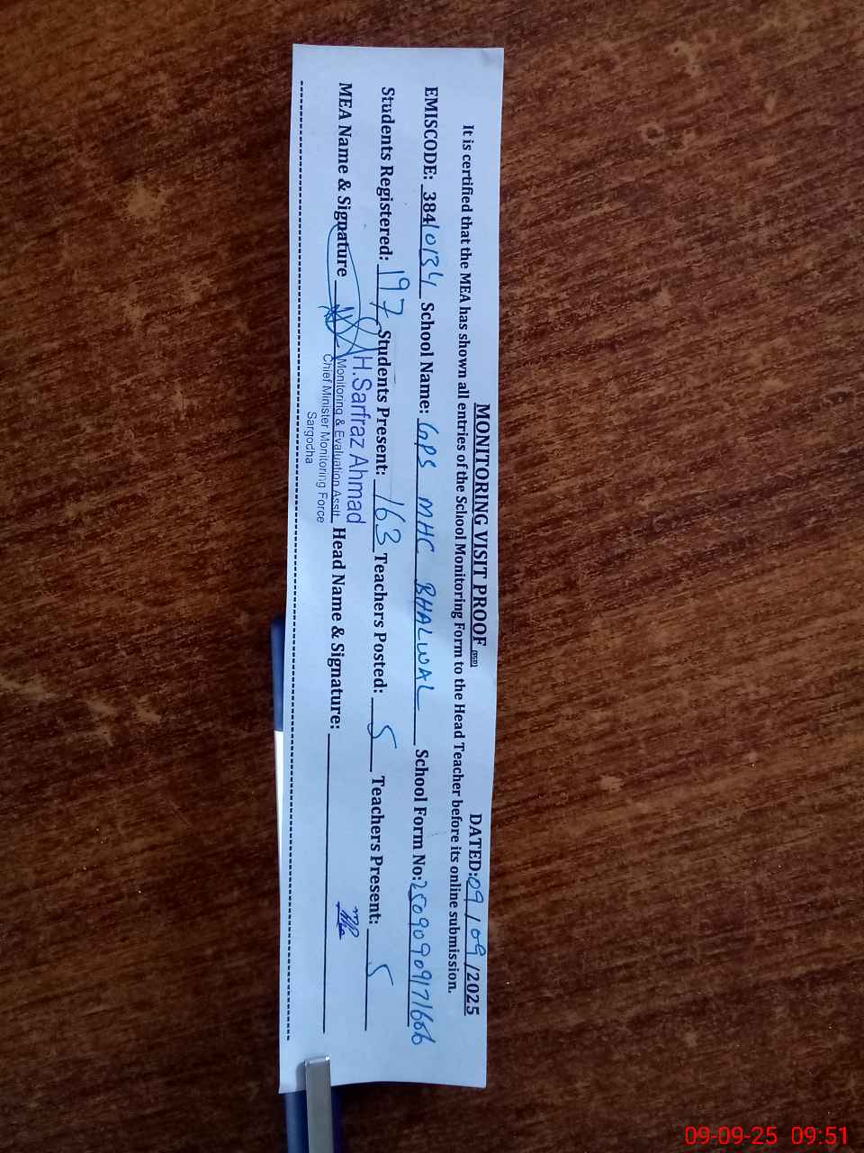 | Monitoring Date: 09-09-2025 | Start Time: 09-09-2025 09:17 AM | End Time: 09-09-2025 09:53 AM | Name of MEA: HA**** SA**** AH**** | |