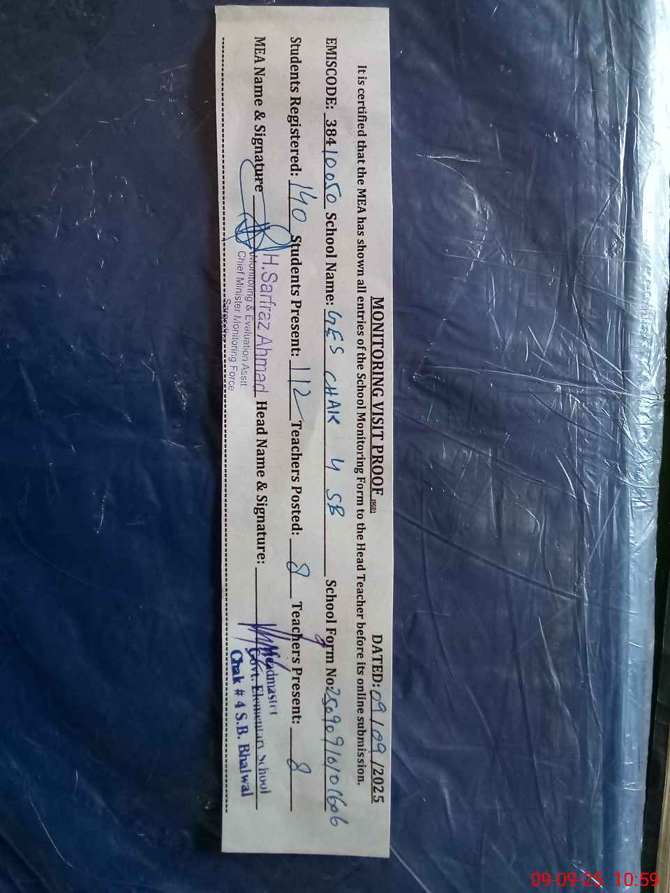 | EMIS Code: 38410050 | Name of School: GES CHAK NO.4 SB | |||