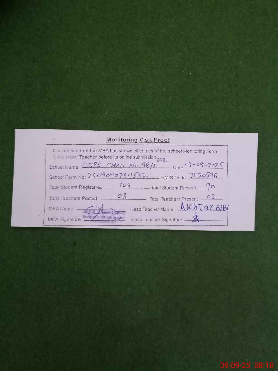 | Monitoring Date: 09-09-2025 | Start Time: 09-09-2025 07:51 AM | End Time: 09-09-2025 08:20 AM | Name of MEA: Ab**** Ra**** BN**** | |