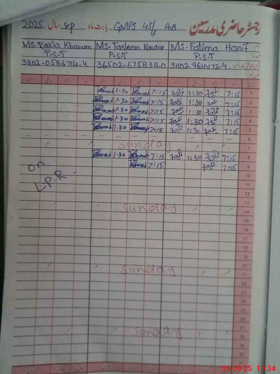 | CNIC | Full Name | Designation | R/C | Absence During Last Calender Month |