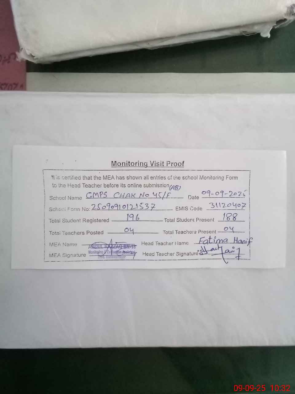 | Attendance Register | Head Teacher | MEA with School | Visit Proof |