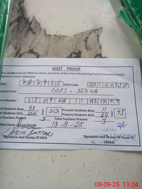 | Attendance Register | Head Teacher | MEA with School | Visit Proof |