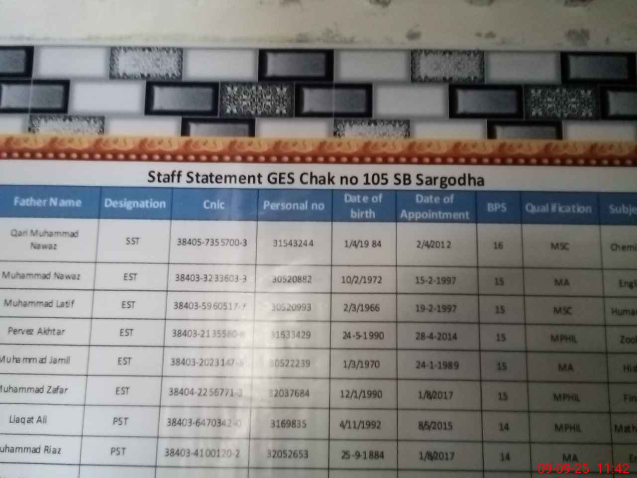 | District: SARGODHA | Tehsil: SARGODHA | Markaz: PULL 111-SB - MALE | Level: Middle | |