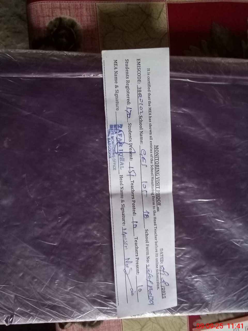 | Monitoring Date: 09-09-2025 | Start Time: 09-09-2025 11:03 AM | End Time: 09-09-2025 11:43 AM | Name of MEA: ZA**** IQ**** | |