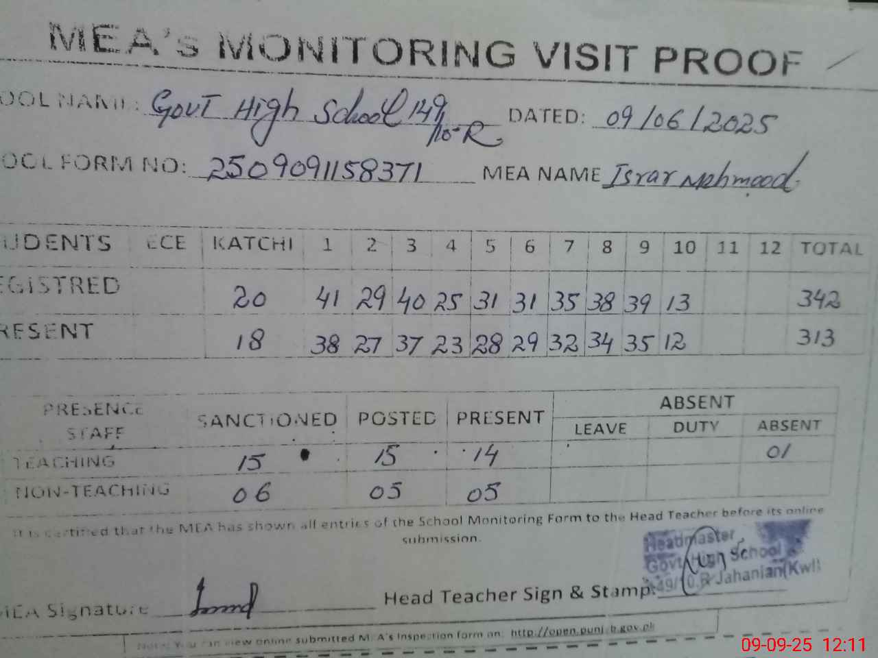 | Attendance Register | Head Teacher | MEA with School | Visit Proof |