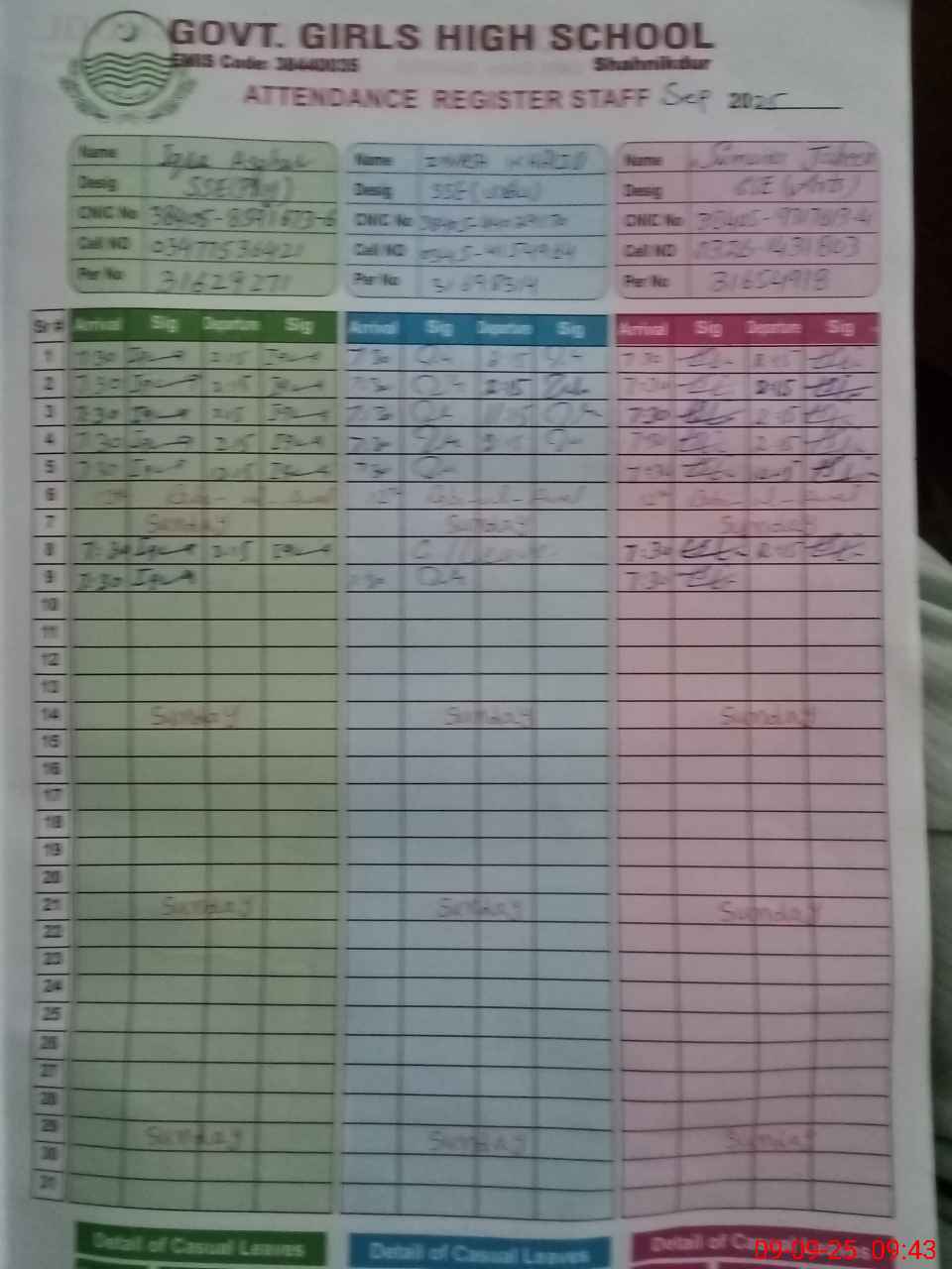 | CNIC | Full Name | Designation | R/C | Absence during last cal. month |