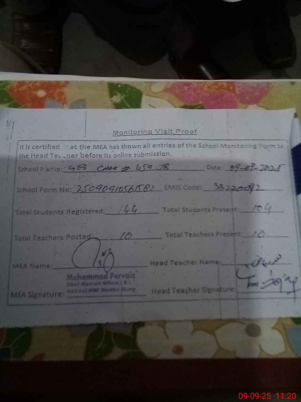 | EMIS Code: 33220092 | Name of School: GES CHAK NO 459 JB | |||