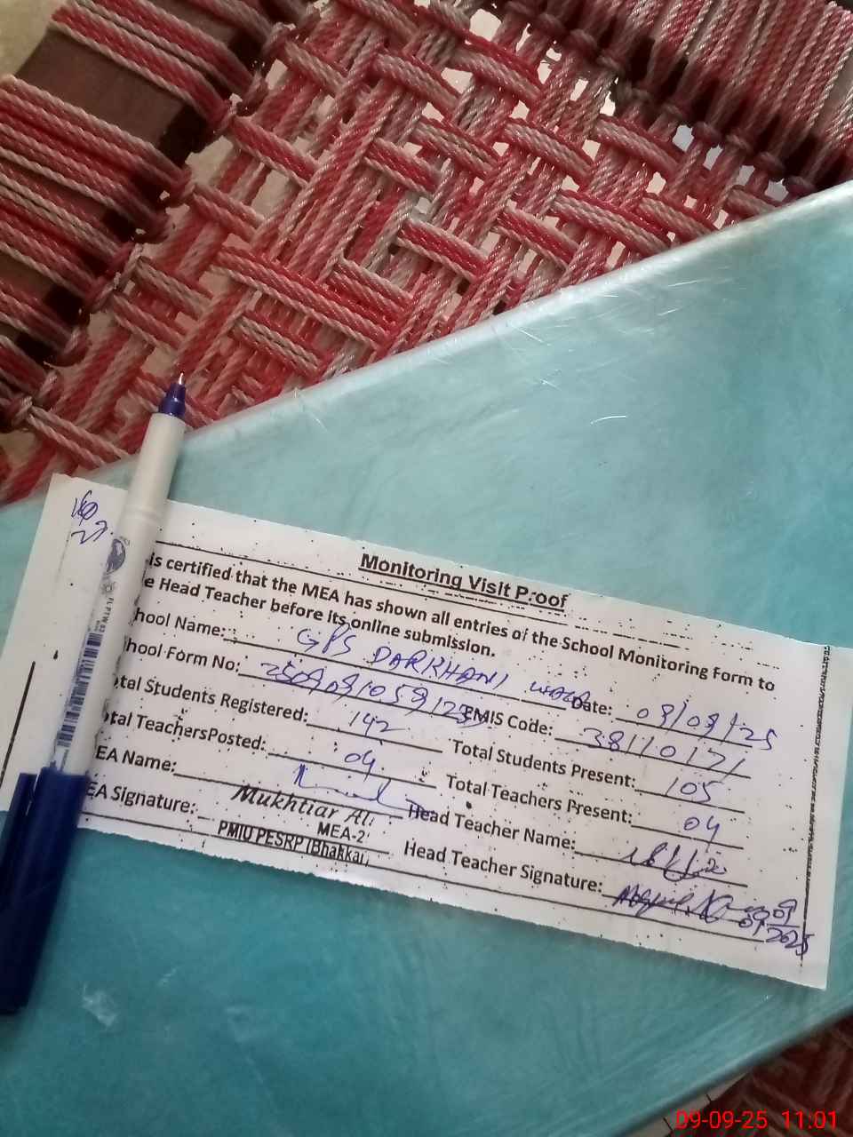 | Attendance Register | Head Teacher | MEA with School | Visit Proof |