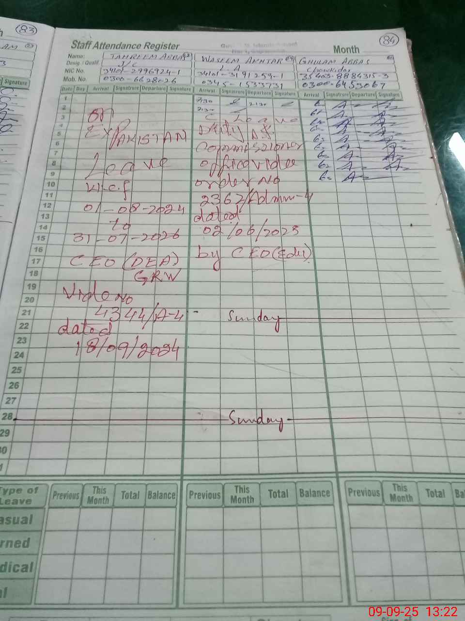 | CNIC | Full Name | Designation | R/C | Absence During Last Calender Month |