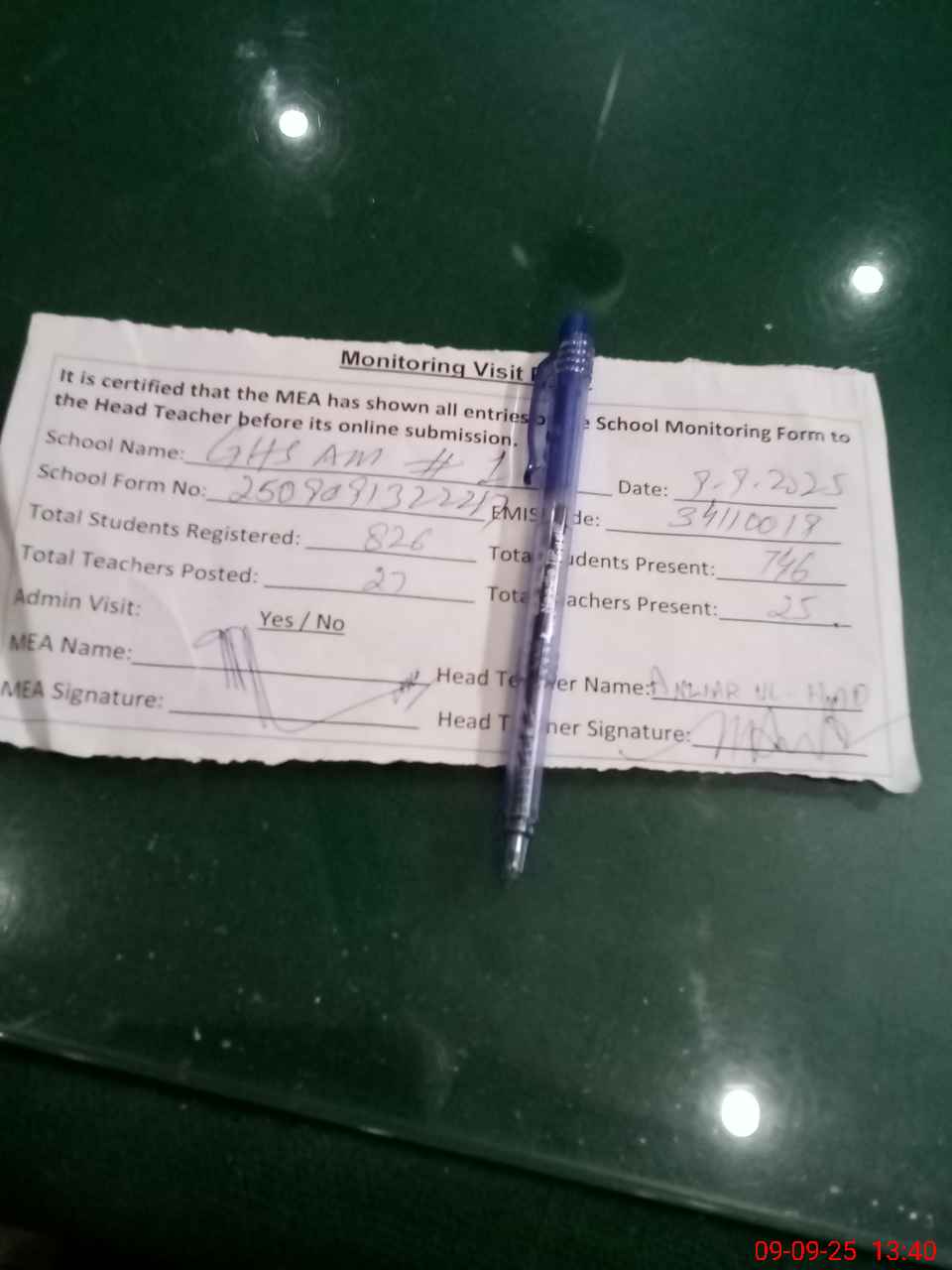 | Attendance Register | Head Teacher | MEA with School | Visit Proof |