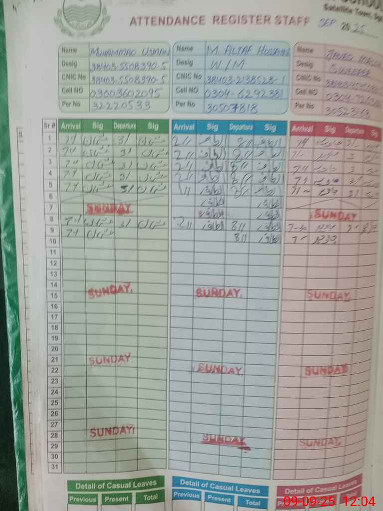 | CNIC | Full Name | Designation | R/C | Absence During Last Calender Month |