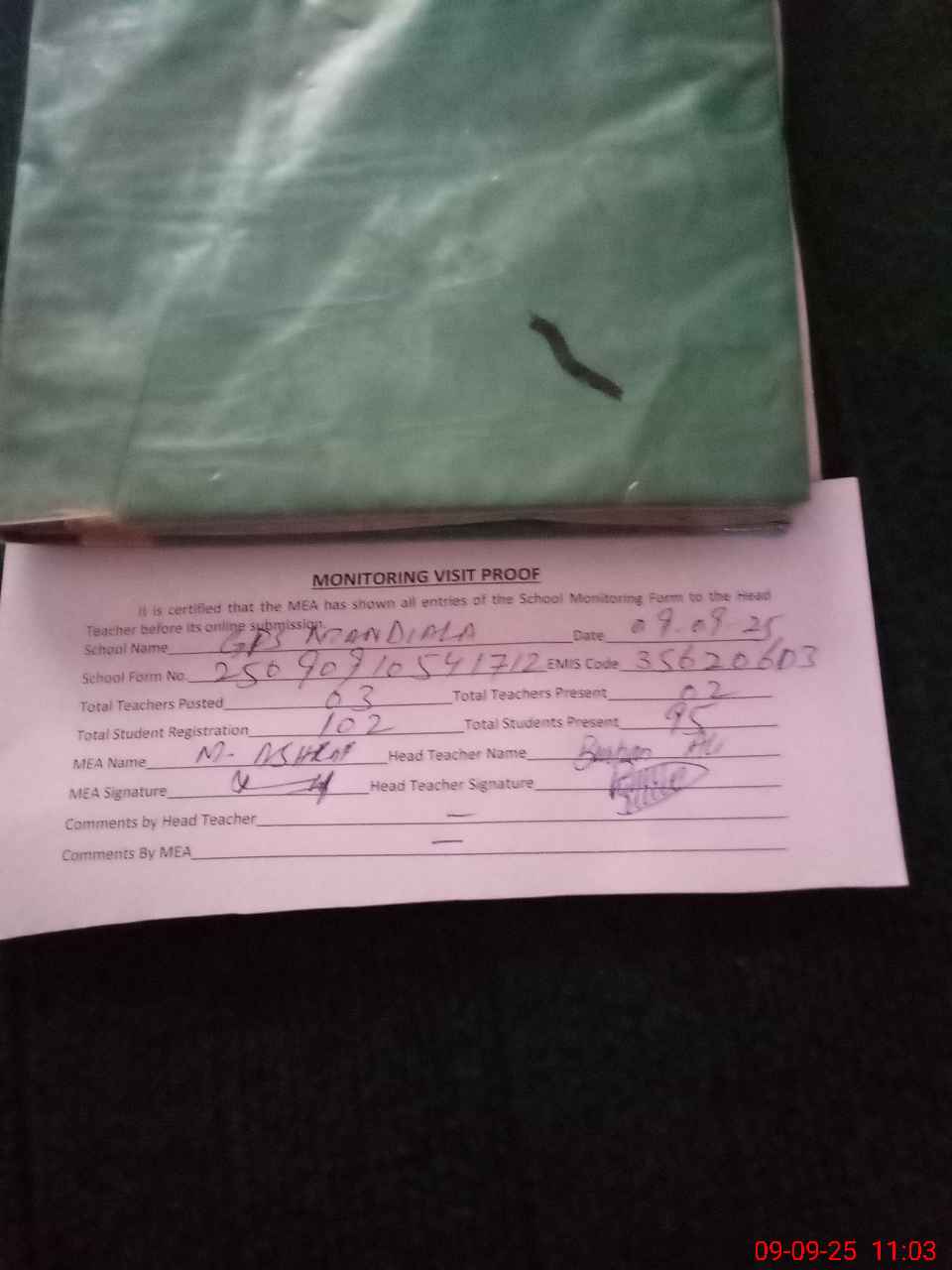 | Attendance Register | Head Teacher | MEA with School | Visit Proof |