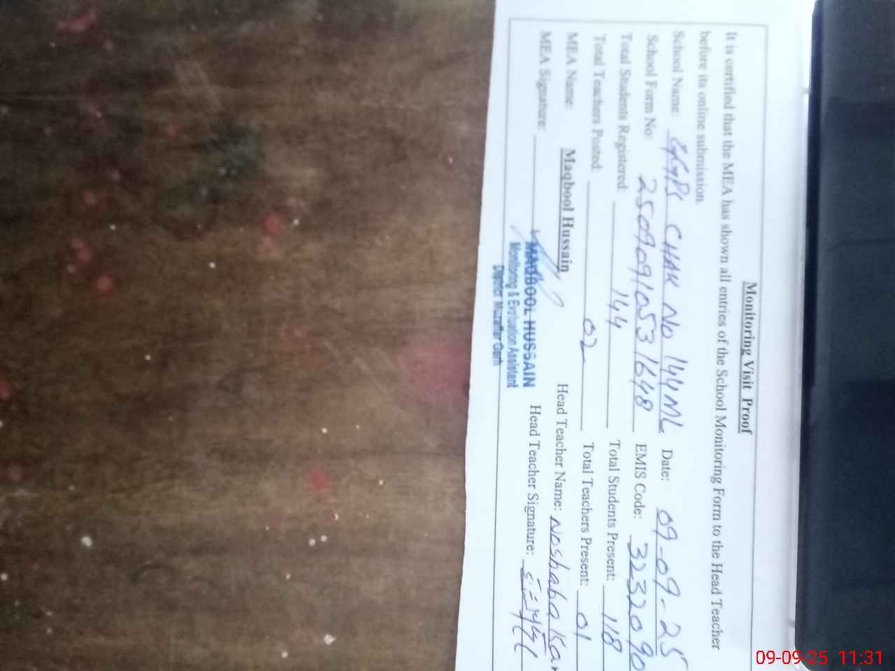 | Attendance Register | Head Teacher | MEA with School | Visit Proof |