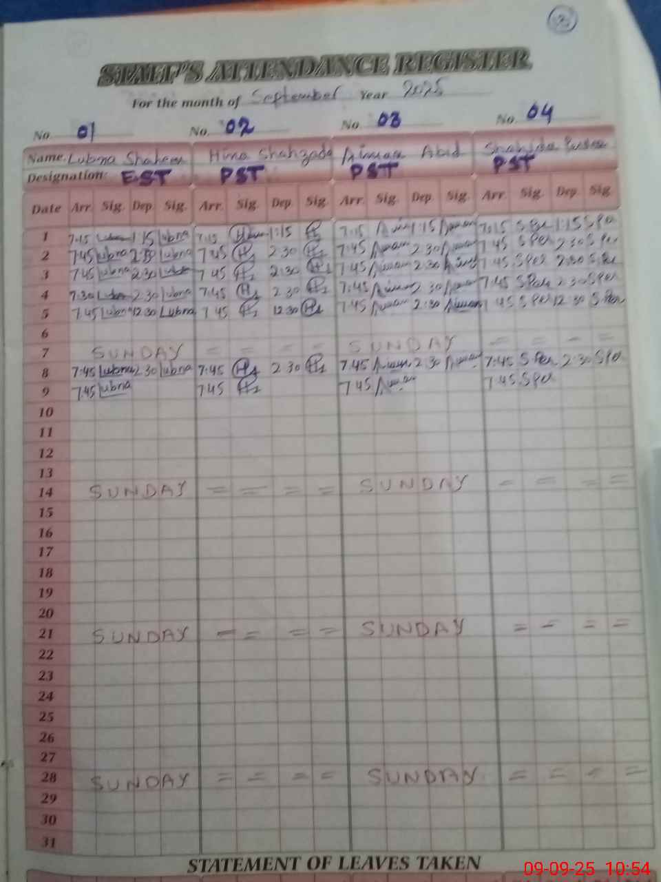 | Remarks (Use Separate Page if Required): Muhammad Asghar security Guard physically not present in the school so mark him present Majid Ali Naib Qasid perform temporary duty in the school | |||||