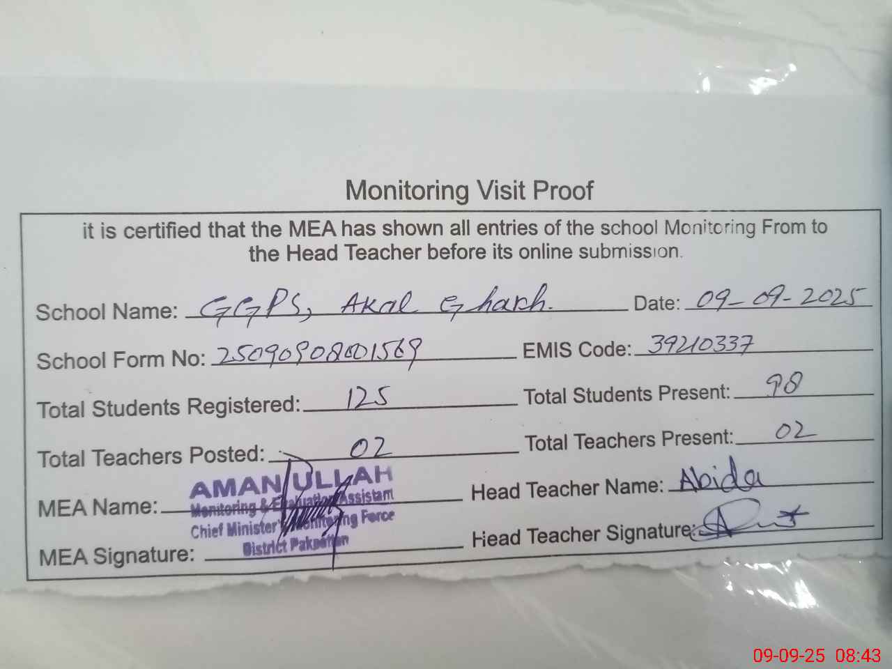 | Attendance Register | Head Teacher | MEA with School | Visit Proof |