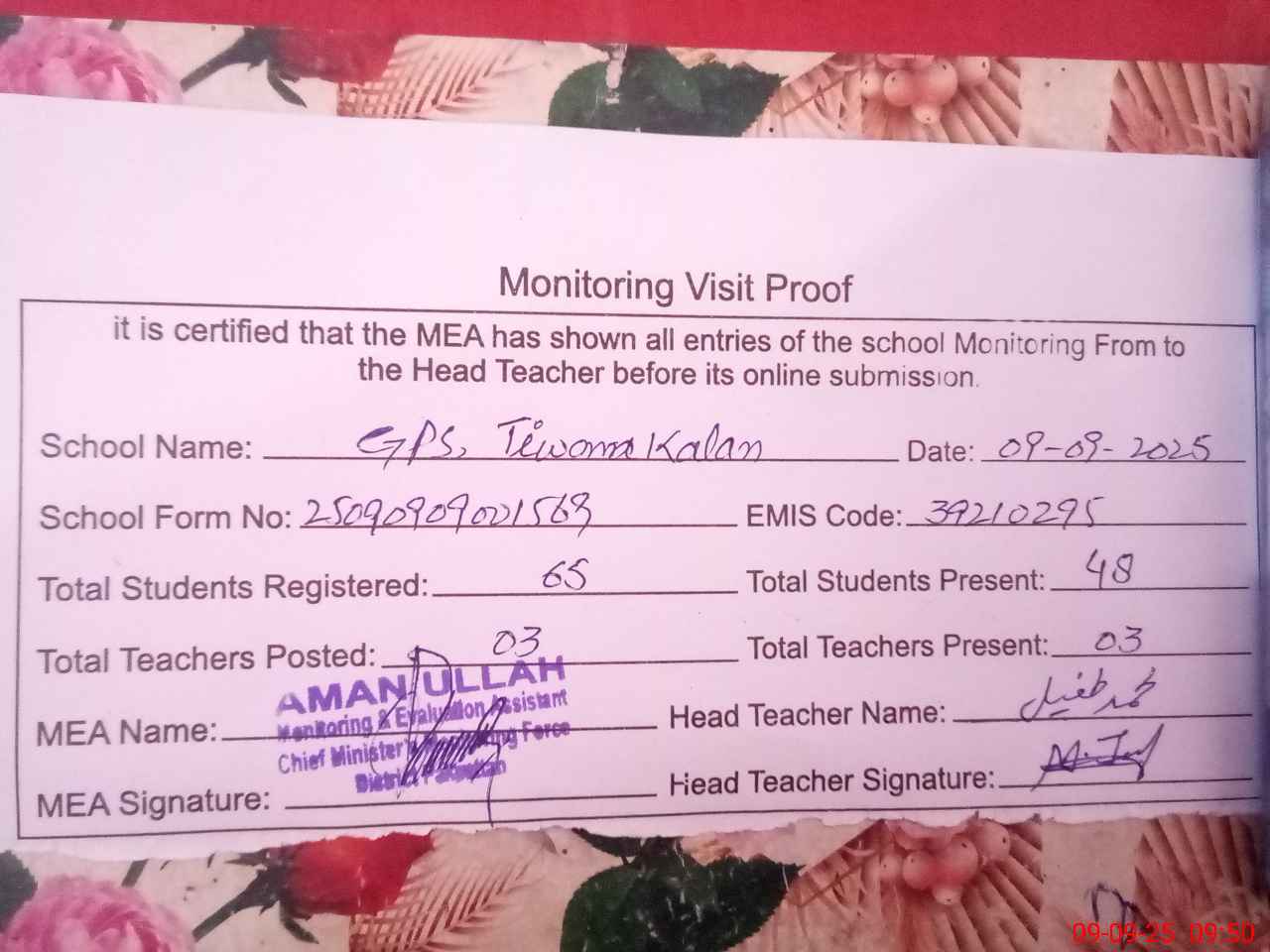 | Attendance Register | Head Teacher | MEA with School | Visit Proof |
