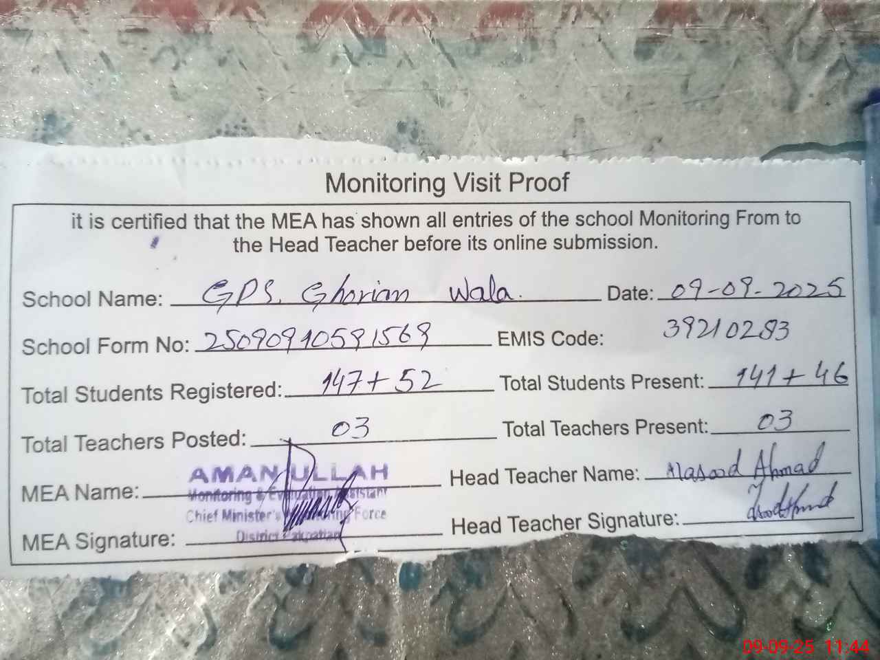 | EMIS Code: 39210283 | Name of School: GPS GHORIAN WALA | |||