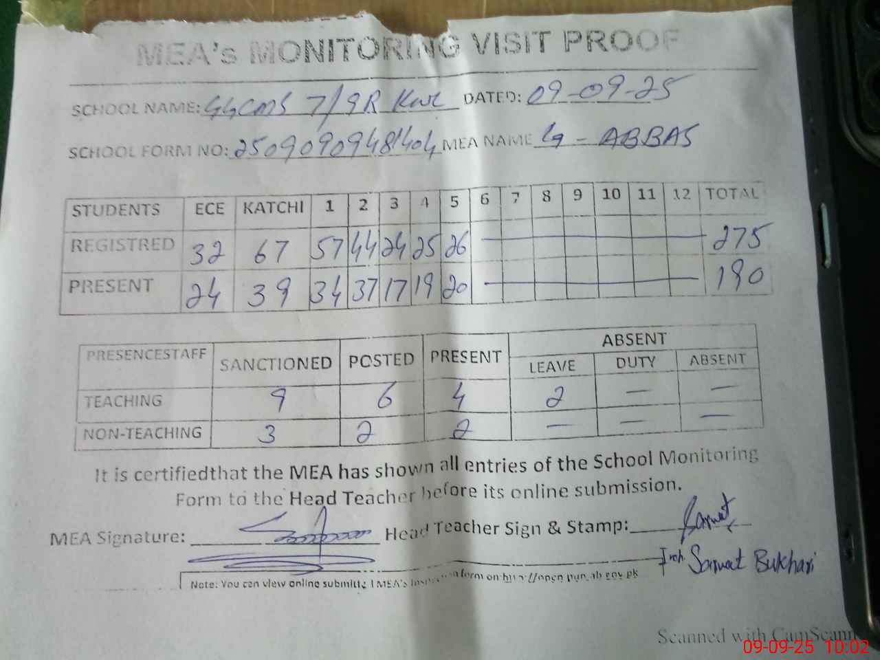 | Attendance Register | Head Teacher | MEA with School | Visit Proof |