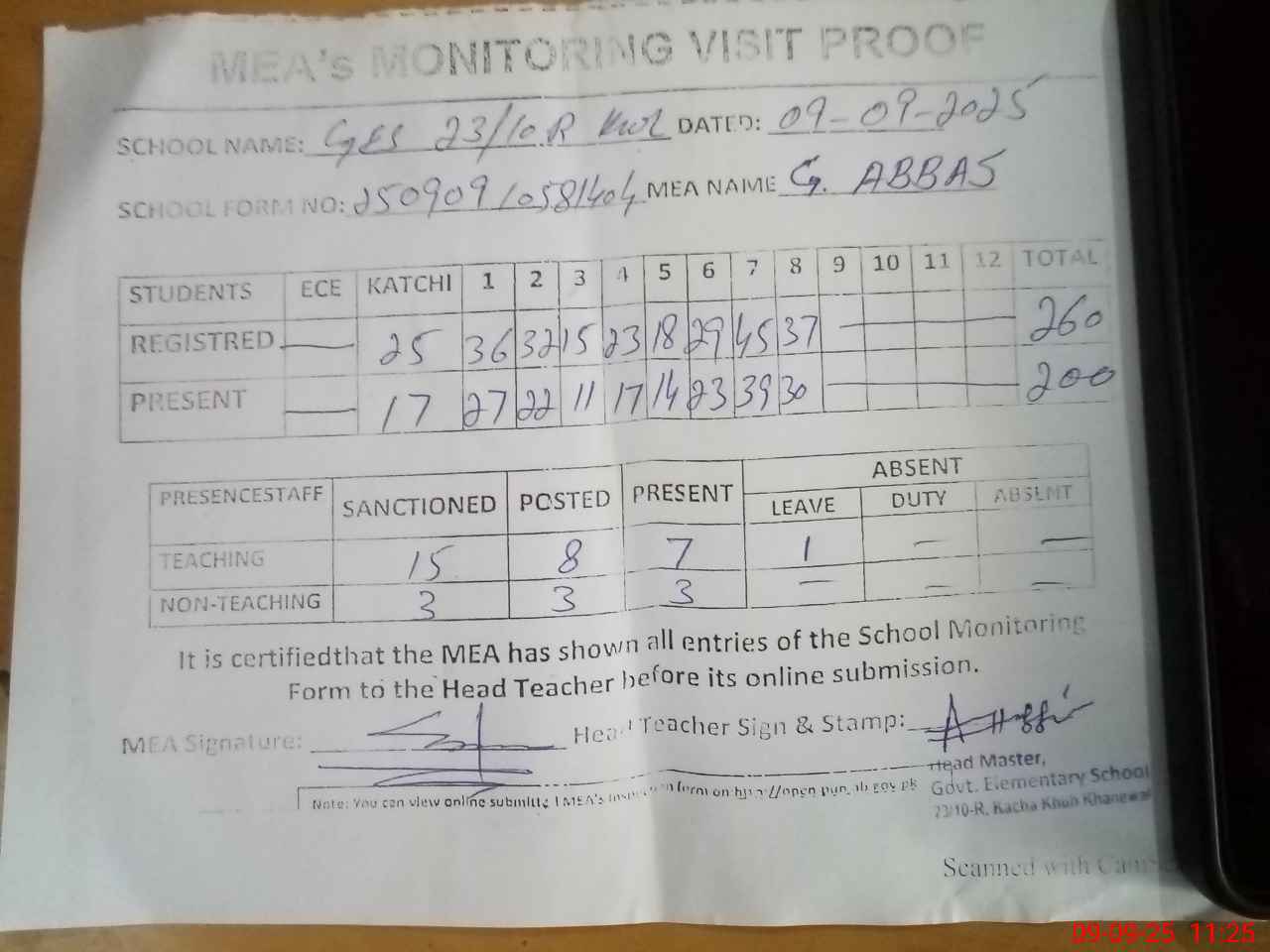 | Attendance Register | Head Teacher | MEA with School | Visit Proof |