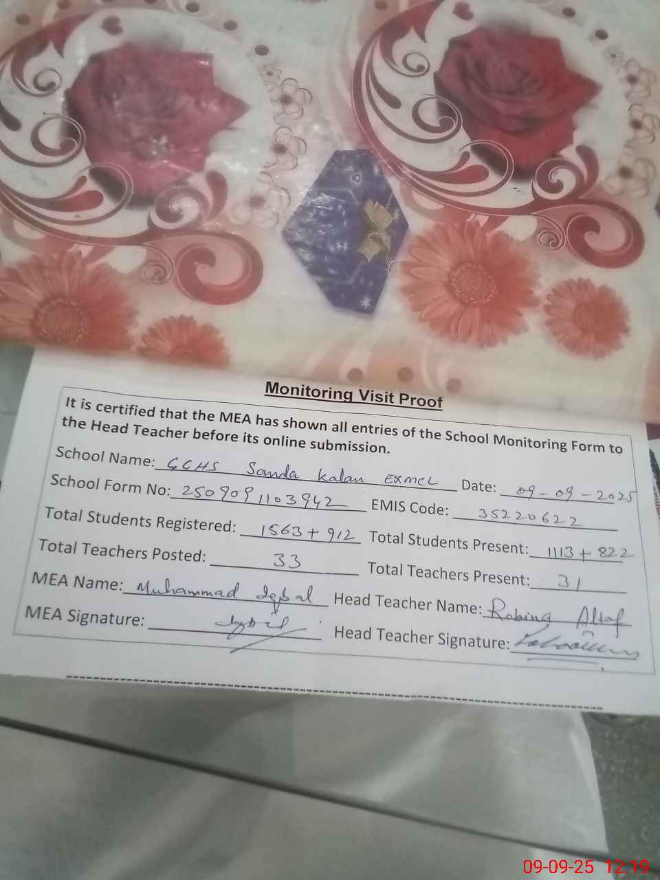 | EMIS Code: 35220622 | Name of School: GGHS SANDA KALAN (EX-MCL) | |||