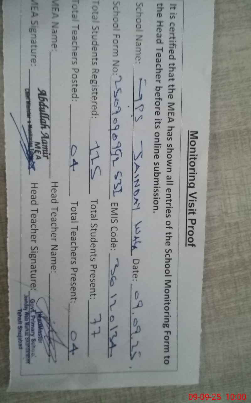 | Attendance Register | Head Teacher | MEA with School | Visit Proof |