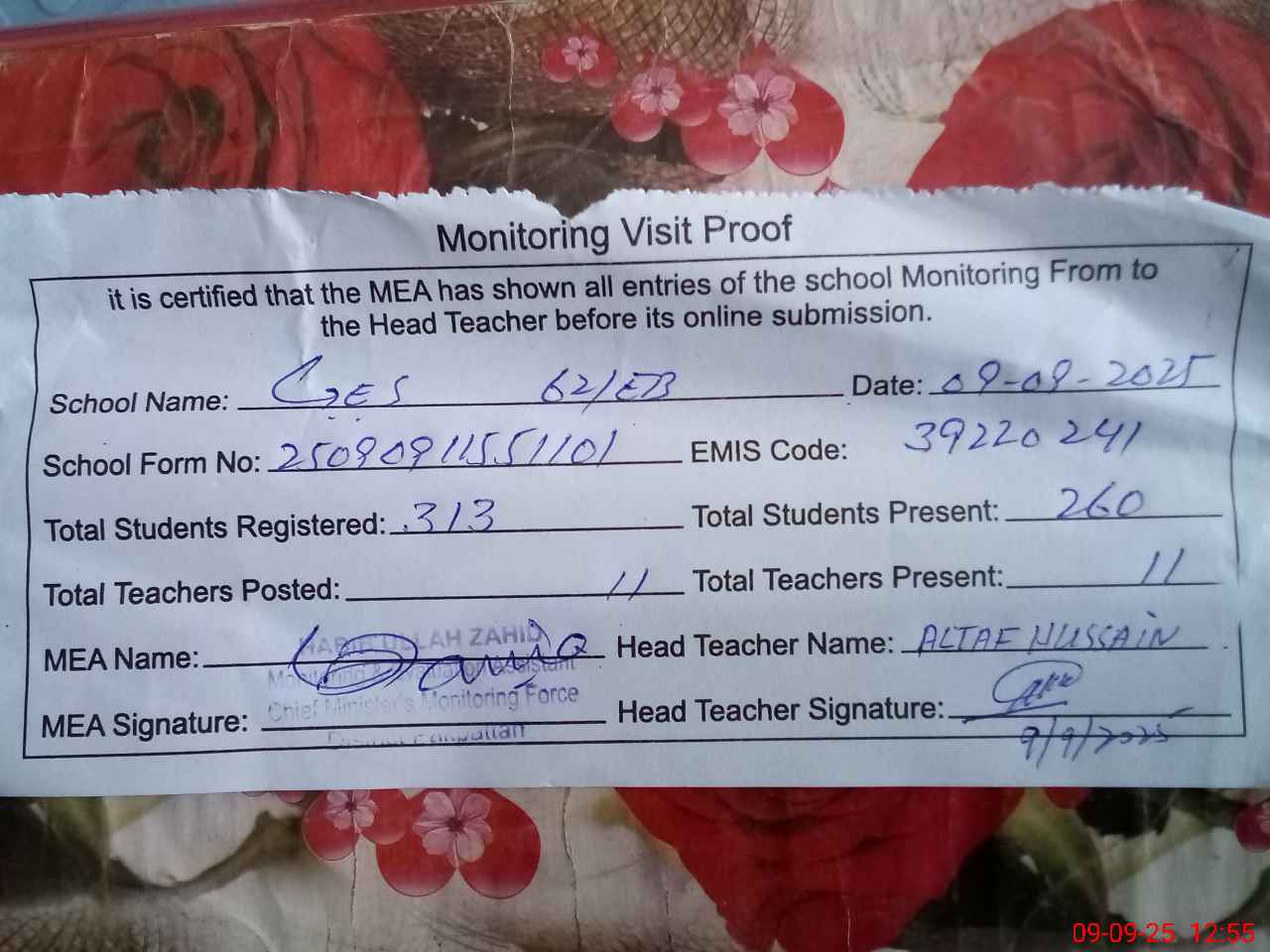 | Certified that this School was Inspected by the Undersigned MEA/DMO Today and the Information Stated Above is as Per Record. | |||||